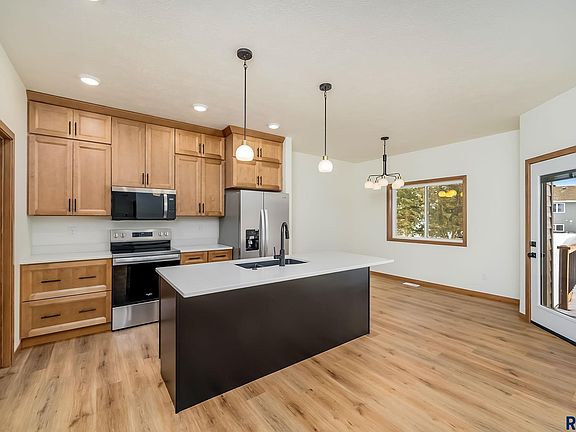 Welcome to Sioux Gardens! Step inside and you’ll immediately fall in love! The stunning kitchen features a stainless steel appliance package, rich toffee perimeter cabinets, bold black island cabinetry, quartz countertops with a sleek Blanco undermount sink, and luxury vinyl plank flooring. A spacious walk-in pantry adds both function and style. The interior details truly shine with black painted doors that make a striking statement, while the mudroom with built-in lockers and a main floor laundry bring everyday convenience. The living room is warm and inviting with a trayed ceiling accented by beautiful beams, creating a cozy yet elevated feel. Luxury vinyl plank flooring flows through the living, dining, entry, laundry, mudroom, bathrooms, and walk-in pantry for a cohesive, low-maintenance finish. The bathrooms feature modern black vanities and Moen Genta faucets, tying the entire home’s design together. Enjoy outdoor living on the partially covered rear deck and the ease of a well-designed floor plan built for both comfort and style.
