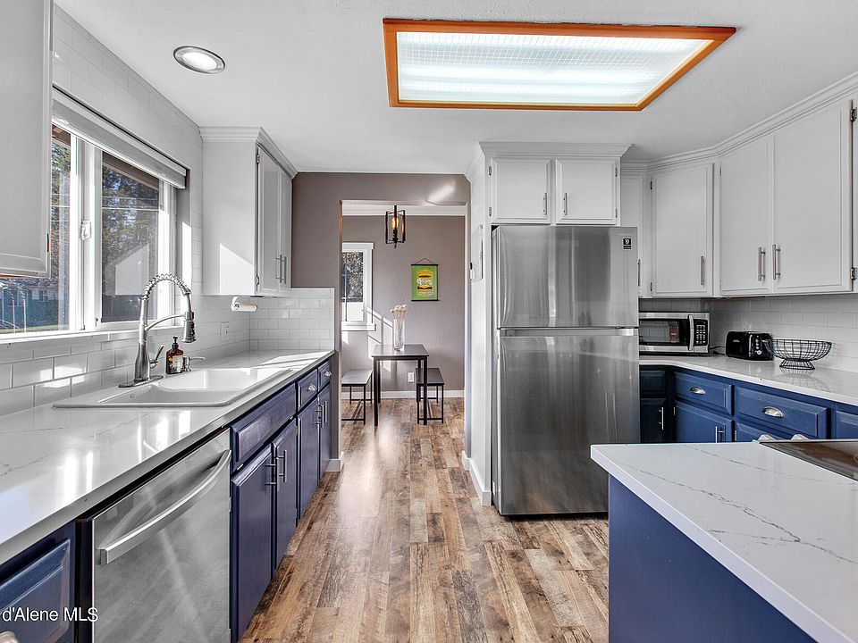 Looking for a downtown home near-by shops, dining, bistros & lake, with loads of charm & character? Look no further, this Remodeled gem comes equipped with new floors, paint, lighting, hardware & trim work throughout, new mini split, large ensuite w/gas stove, 2nd bedroom w/added storage, new kitchen w/deep Kohler sink, gorgeous quartz countertops, SS appliances, breakfast bar & retro dining nook w/corner window, new bathroom, floating shelves & new washer/dryer included! Covered front porch, nice lawn, ample on-site parking, detached garage w/room for workshop, covered carport & a 7x14 shed w/power. Close to Sanders Beach, Tubs Hill, zoned R-12, welcome to downtown CDA!