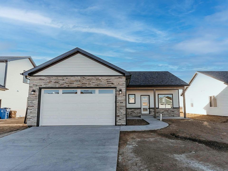 New Construction - Ridgeline Homes' San Juan model modified to a 3-bedroom with windows added to bathrooms and garage, additional kitchen cabinets, and master bath modified to include a double vanity.