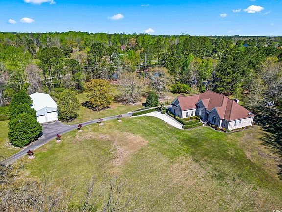 Welcome to your custom-built haven on 4 acres of meticulously landscaped property. This all-brick masterpiece boasts functionality at every turn. Step inside to discover this charming 3-bedroom 2.5-bathroom home, featuring hardwood floors throughout and ceramic tile in all wet areas. The oversized 2-car garage, freshly painted, offers ample space for your vehicles and storage needs.Entertain with ease in the gourmet kitchen, updated with granite countertops, solid maple cabinets, and newer appliances. A custom food pantry ensures organization is effortless. Enjoy the tranquility of the split floor plan, with a master suite offering a sitting area, ensuite bathroom, and walk-in closet complete with a built-in closet system.Two additional guest rooms share a bathroom w/ linen closet.The living room and dining room boast soaring 15-foot ceilings, accentuating the spaciousness and elegance of the home. Warm up by the brick wood-burning/gas fireplace on cozy evenings.Work from home in the bonus room/office, equipped with built-in desk and cabinetry. All windows have built in plantation blinds. Outside, the possibilities are endless with a steel building for workshop, boat or RV storage (Door opening 12ft x 11.8ft) a restored historical smokehouse at the entrance, and a greenhouse in the backyard. Relax on the large outdoor raised brick patio area, perfect for hosting gatherings or simply enjoying the peaceful surroundings. Located near downtown Loris & 2 miles from Mcleod Loris Hospital. NO HOA. Experience true Southern Living in this extraordinary residence! Furnishings can be purchased seperately or will be sold in estate sale.