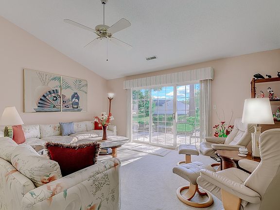 Wonderful view from this immaculate 3 bedroom, 2 bath home with beautiful landscaping, situated on a large corner lot with a view of the pond in the 55+ community of Woodlake Village. Nestled on a cul-de-sac, this spacious home features a wooded backyard with pond. Good curb appeal with nicely landscaped front yard, house with brick veneer, tan shutters, covered entryway with slate porch, attractive front door with transom window, decorative side lights and storm door. Open floor plan with lots of natural light. Enter the home into a tiled foyer that leads to the spacious and open living room with vaulted ceiling, carpeting and sliders overlooking the backyard patio. Family dinners are sure to be enjoyed in the adjacent dining area with two windows overlooking the yard. The spacious eat-in kitchen features a bright and cheery breakfast nook, work island, black appliances and breakfast bar. The pantry provides lots of storage, while the counter space gives you plenty of room to work. Kitchen also features a laundry area with cabinets for storage and washer & dryer that convey. The dining area flows into the bright and spacious Carolina Room with two skylights and windows all around bringing in lots of natural light. The Carolina Room with a view of the backyard pond is sure to be your favorite spot to start your day, relax or read an enjoyable book. Or better yet, head to the private backyard. What a great spot for grilling, entertaining and building memories with family and friends. The spacious master bedroom with walk-in closet overlooks the backyard. Master bath with ceramic tile, tub/shower and vanity area. Two good size guest bedrooms, one currently used as a den, and guest bath with walk-in shower. Two car garage with floored storage in attic, utility sink and side door from garage to outside. This one owner lovingly maintained home has great curb appeal with easy to maintain vinyl siding, nice landscaping, sprinkler system, and termite bond. New roof (October 2021), HVAC (December 2012), water heater (November 2018), newer windows (July 2012). Great value home on beautiful lot. Make an appointment to see, you will not be disappointed. Conveniently located about 2 miles from the beautiful blue Atlantic, golf courses, hospital, marina, restaurants and shopping. Great amenities with low HOA fees. Community pool, clubhouse with library, pickleball and shuffleboard courts. Measurements and square footage are approximate and not guaranteed. Buyer is responsible for verification.