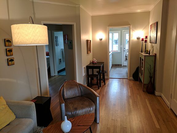 This is a large bright one bedroom apartment. The building has all the character one would expect from a building built in the 1930's. With a front and back door in a nice setting with a large yard, this is as close to living in a little house as you can get. It has beautiful fir hardwood floors that have been expertly refinished by CZ Becker hardwoods. The kitchen has a window and a door to the back yard, it has been renovated with new counters and appliances, tile floor. From the walls in this apartment has been renovated. All the windows have been replaced, and the building has been re-insulated to meet current energy standards. It is on the MAX line one block from the stop and one block to New Seasons market. If you work down town there is no need to even drive, save on parking and the hassle. The kitchen is large enough for a dining room table. Private fenced in yard, perfect for summer bbq's or just hanging out. Storage locker included. Laundry on site. Front and rear entrance that opens to large private fenced yard. Hot water is included in the rent. But due to cost there is a $20 charge for water if there are two tenants. If you have a stable employment history and good credit call for more information. $1085. Per month. One year or two year lease available. Prefer long term tenants. Due to the hardwood floors we do not allow dogs. 541-490-349one. Texts or calls get faster response. Don't email without contact information and a description of yourself and your housing needs. $20 per month water/sewer surcharge for second tenant if applicable.
