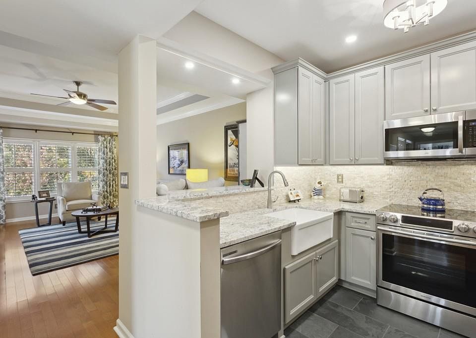 This top floor, corner unit features a barely lived in, recently renovated kitchen and bathroom, plus treetop and community views from the wrap around balcony. The stunning kitchen and bath renovations feature under cabinet lighting and farmhouse sink in the kitchen, granite counters, slate floors, and beautiful tile work at the kitchen backsplash as well as throughout the bathroom. All appliances, including the washer and dryer, remain with the property and have been barely or in some cases never used. This top floor unit features tray ceilings for added height. Additional upgrades include plantation shutters throughout; new draperies; custom closets in both bedrooms, hallway and laundry closets; and a NEST thermostat. HVAC and water heater less than 5 years old. Community amenities include two pools, fitness center, grilling area, dog park, clubhouse with catering kitchen, gated entry, secured underground parking, beautifully maintained landscaping, and on-site management. Great location convenient to I-75 and I-285, shopping, restaurants, plus Truist Park and The Battery. And just minutes to Buckhead, Midtown, Downtown Vinings, and the Chattahoochee River National Recreation area and trails. Complex is not FHA or VA approved.