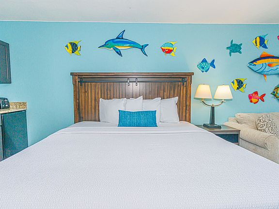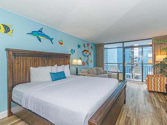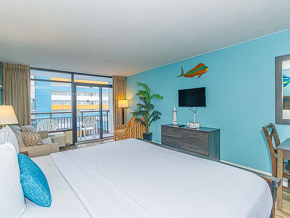 Renovated and updated interior studio/efficiency in the Landmark Resort. Great price to get into a turn key condo an oceanfront building with loads of amenities and strong rental history. Updated flooring, King bed and pullout sofa, decor and furnishings. Granite countertop in the bathroom and kitchenette area. These style units also have the lowest HOA dues in the building, covering insurance, electric,  water, cable/internet, parking and more.