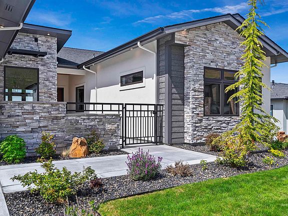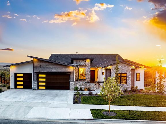 Revel in panoramic 180-degree views of the Boise Valley from this daylight basement design. Indulge in culinary delights with top-of-the-line Gaggenau appliances, including a 6-burner cooktop with griddle, double oven with steam convection, built-in coffee maker, refrigerator, double dishwasher, & 99 bottle wine cooler. The master suite offers luxurious amenities such as a spacious walk-in shower, heated tile floors, a soaker tub, and a generous closet with direct access to the laundry room. This split bedroom layout showcases exquisite finishes including quartz, tile, stone, and organic engineered hardwood, complemented by high-end lighting fixtures. Venture downstairs to discover a vast rec room, workout area, & additional TV room with a bar featuring a beverage refrigerator, dishwasher, ice maker, & sink. The two covered patios invite you to relax & savor the endless vistas in style. The 3 car garage boasts epoxy flooring + tandem 4th car space with additional backside garage door opening for scenic views.
