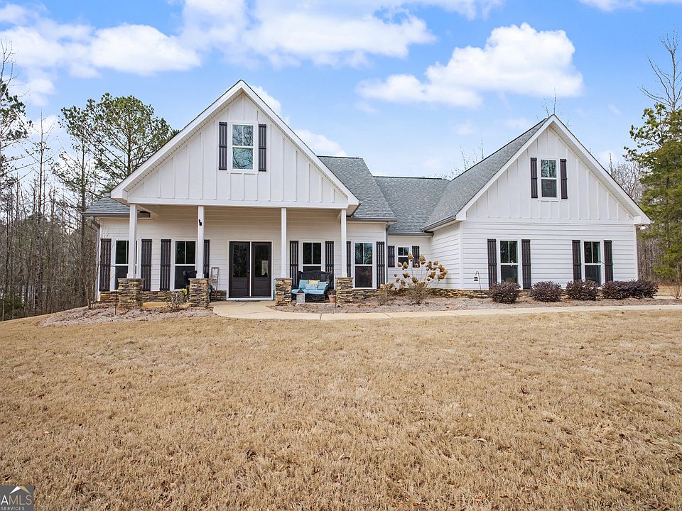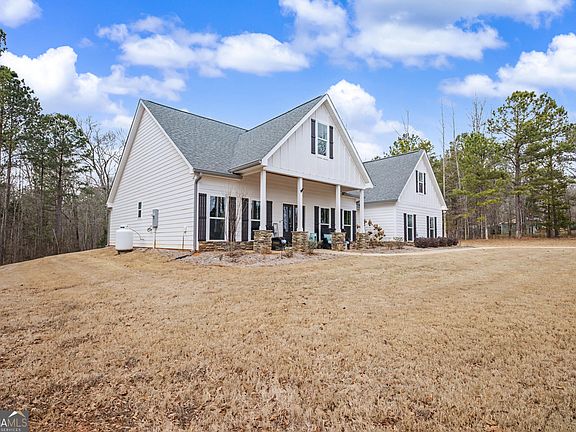 Beautiful Craftsman-style home situated on 6.33 acres in Pike county! offering 4 bedrooms, 3 baths, and over 2600 sq ft with a desirable split-bedroom plan. The spacious primary suite features a separate tile shower, free standing tub, and generous closet space. Open-concept kitchen with large walk-in pantry flows into the family room with fireplace and built-in bookshelves. Upstairs bedroom with private bath is ideal for a teen suite, guest room or flex space. Enjoy outdoor living on the covered back porch with fireplace & TV. Plenty of space inside and out-this home has so much to offer!