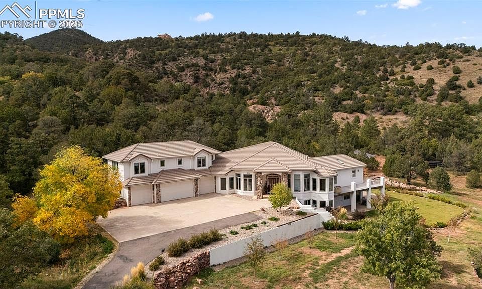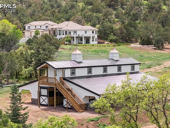 Red Rock Sterling Ranch is located 20 minutes southwest of Colorado Springs within the prestigious gated community of Turkey Canon Ranch Estates. Tucked up against the mountains, this area abounds with natural beauty and vistas of mountain peaks and red rimrock canyons. This property features a 6,372 square foot home set on 35.01 acres adorned with trees, scrub oak and open meadows. Offering the convenience of main floor living, the residence includes a five bed and six bath floor plan. The main floor primary suite is a true retreat, complete with a fireplace, sitting area, walkout to (2) decks, his/her closets and a five-piece bath. The living room flows into the gourmet kitchen that includes a large island, breakfast nook, fireplace sitting area and a walkout to an expansive covered deck – the perfect spot to relax and enjoy the surroundings. The upper level contains two additional bedrooms, each with its own private bath and a walkout to a private deck. The walkout basement boasts a fireplace, bar, gym and two additional bedrooms and bathrooms. Outdoors you will find a large patio complete with a hot tub, sauna, fire pit and grill area overlooking a pond and waterfall. A new 36X60, five-stall barn is a true highlight of the property. The horse enthusiast will appreciate automatic waterers inside stalls and in pasture areas, wash rack, rubber stall mats, ample feed storage, and a secure tack room. With a few final details needed, the end result will create a very functional setup. Above the barn, there is an unfinished 12x60 space that offers potential for customization into living quarters. Additional features are extensive solar panels for amazing utility costs, storage shed and chicken coop. Red Rock Sterling Ranch offers a unique opportunity for those seeking a luxurious home and exceptional equestrian facilities within an easy drive to amenities.