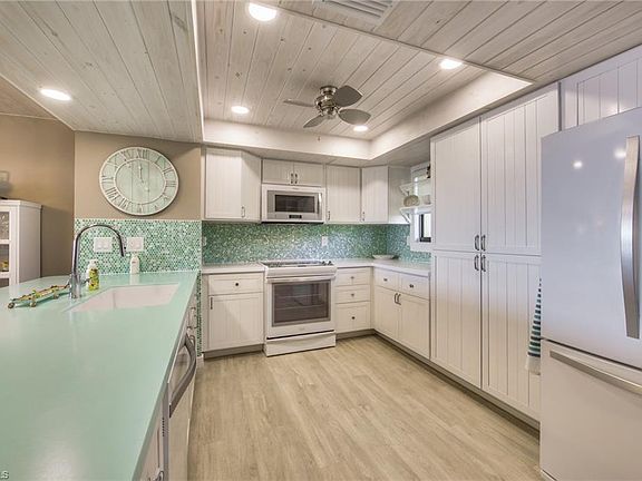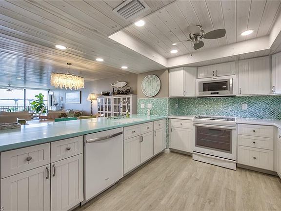 Welcome to Sky Cottage! This stunning 2 bed/2 bath Bayfront condominium has been transformed into a coastal chic sanctuary with a designer's flair. The complete renovation in 2017 includes striking wood planked ceilings throughout and luxury vinyl plank floors in driftwood tones. Custom crafted cabinets with soft close doors and drawers surround the kitchen featuring island-inspired Corian countertops with integrated sink and penny-round glass and marble back-splash, topped off with a stylish beverage bar with refrigerator. The open-floor plan allows amazing bay views with impact sliding glass doors and remote solar shades creating an easy transition between tropical breezes or nearly 1400 square feet under air! Doors and closet organizers have been hand crafted optimizing space and design. Bathrooms are finished in Corian and tile with the master containing dual sinks. Punta Rassa Condos are located at the gateway to Sanibel offering 3 piers, pool, hot tub, shuffle-board, tennis, pickle-ball, dog park, play area and access to the Sanibel Harbor Yacht Club with many social activities. This unit has one designated under-building parking space and large exterior storage.