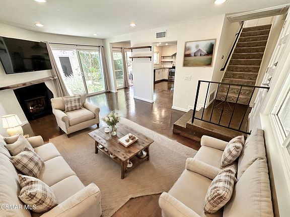 Nestled among redwoods in a park-like setting, this 3bed 3bath townhome is a rare home in the esteemed Varsity Park Villas HOA, not available since 2015. The front yard is landscaped community grounds, with a heated pool, and clubhouse. The backyard is full of zen and charm, perfect for relaxing and hosting. Inside the home you'll immediately notice the open and inviting floor plan. Polished concrete floors with epoxy finish for a modern style and easy cleaning. The open kitchen layout boasts minimalist tones for ease of use, but is also easily expanded on and modified as desired. The downstairs bedroom has hardy bamboo floors, both elegant and durable. This room makes for an excellent bedroom or office with its wonderful glimpses of the front yard. Upstairs bedrooms are comfortable and cozy. The primary bedroom is quite large and enjoys a balcony that gives tree-house ambience, being surrounded by mature trees. The garage is oversized in height and will undoubtedly be useful for all sorts of storage, activities, and tools. Additional amenities include a large walk-in pantry, in-unit laundry, and double pane windows and recessed lighting throughout. Moorpark is experiencing incredible and vibrant growth in both the historic downtown High St., Princeton Avenue, and Moorpark College. This home is central to all these community improvements.