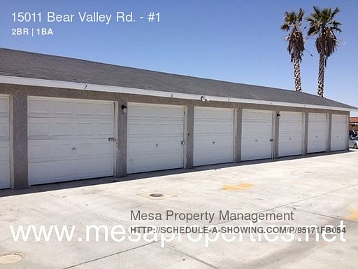 SCHEDULE A SHOWING ONLINE AT: showmojo.com/lh/95171fb054 2 bedroom 1 bath apartment with a 1 car detached garage. Private backyard and close to the 15 freeway on Bear Valley Rd. Video walk through at www.mesaproperties.net Call (855) 404-Rent Ext. 6 for showings * Amenities. Air filter 20x20x1