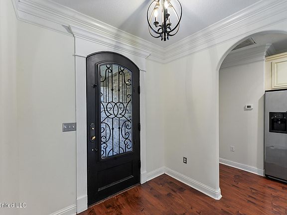Two car garageOpen concept floor planTall ceilingsCustom cabinetryTray ceilingsPlenty of storage spaceTriple crown molding