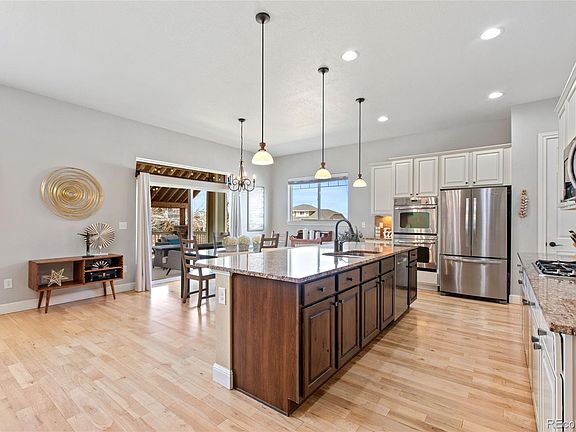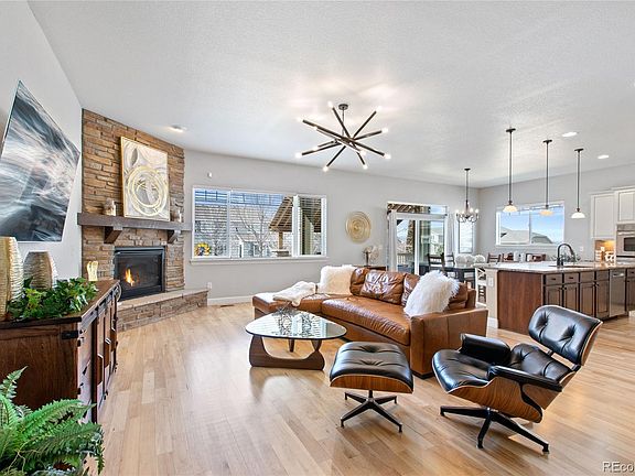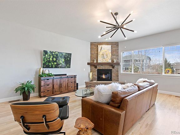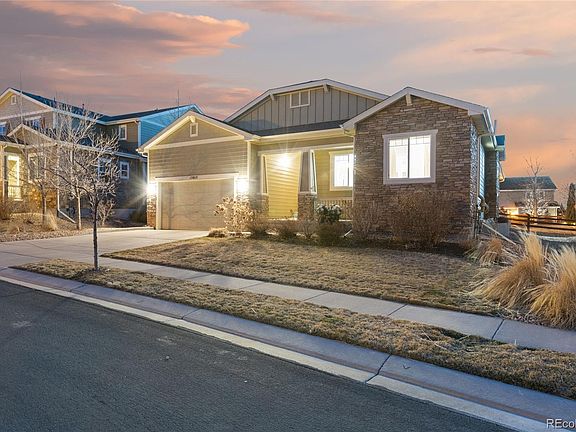 Start making memories as you open the door to this spectacular ranch home! A spacious foyer welcomes you with 10’ ceilings, and beautiful maple hardwood floors lead you into the generous great room with a stone fireplace. The gourmet kitchen has a wonderfully large island, stainless appliances including a gas cooktop, soft white cabinets with a cappuccino glaze, slab granite, tile backsplash, large pantry, and a butlers pantry leading to the gracious formal dining room, currently being used as a playroom. Abundant windows bathe this home in cheerful natural light. The sliding patio door takes you to a covered porch and the yard that backs to open space with a view of the Rocky Mountains. Perfect for entertaining year round! The primary suite has a 5-piece spa-like bath with extensive upgrades, a large walk-in closet, and a bay window for relaxing and enjoying the mountain views. Three additional bedrooms are located on the other side of the home’s main level, along with a fully upgraded bath. Enjoy the convenience of the main floor laundry room with cabinets and counters galore. The professionally finished lower level with 9’ ceilings has an incredible layout. The huge living area has been designed as a great place to spend time with family and friends. There’s room for playing pool, air hockey, ping pong, or watching the big game together. The bar area includes a full-size refrigerator, dishwasher, and microwave. Three conforming bedrooms, a beautiful full bathroom, and ample storage finish off this floor. This would be a great home for multi-generational living. The three-car garage includes a tandem which could be used for a workshop or hobby space. Storage abounds in this space with very high ceilings as well with a loft area above the tandem. So many options! Quiet cut-de-sac, close to parks, trails, breathtaking mountain views, open spaces, great schools, easy access to Boulder, Denver, DIA, shopping, and dining.