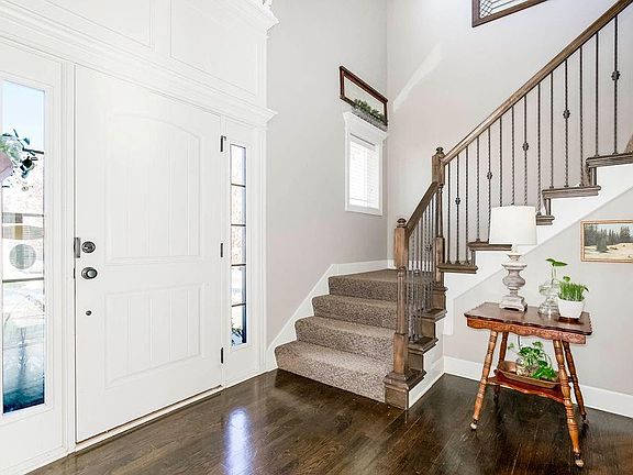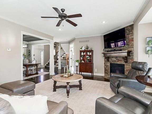 Bringing the wow factor on this one! From the curb this is a show stopper! As you pull up to this house you are welcomed with the awesome curb appeal and front covered entry! The crisp landscaping is sure to delight when it is in bloom! This generous 2 story offers so many upgrades. As you enter you are presented with a 2-story entry and open concept floor plan. The dining room is generous size offering wood floors that continue through the first floor. The living room opens to the kitchen and dining room and offers a gas fireplace encased with gorgeous stone. The kitchen is perfection offering stainless steel appliances including refrigerator, new dishwasher-2022, new microwave-2022, beverage fridge, gas range and wall oven. Just off the kitchen is the eat-in area surrounded by windows. Don’t miss the first-floor office with glass French doors and overlooks the gorgeous backyard. The second floor offers 4 spacious bedrooms starting with the master suite that offers new LVT flooring, sitting room offering great flex space, ensuite master bathroom with jacuzzi tub, double sink vanity offering an abundance of cabinetry with separate makeup area and walk-in shower. The master closet is sure to please offering incredible storage and custom built-ins. The secondary bedrooms offer LVT flooring and neutral carpet, vaulted ceilings, ensuite J&J bath, and neutral fresh paint throughout. The finished lower level is the perfect rec space with 2nd living space & great additional flex space with an oversized storage area. The backyard is incredible offering iron fence with 2 gates, covered deck, freshly stained Dec-2023, expanded concrete custom patio and upgraded landscaping. New hot water heater-2022, new sump pump-2023, adding ceiling fans to all bedrooms, added sliding door to master bath, custom built shelving in basement storage and added top storage racks in garage. This house is a complete package with amazing neighborhood amenities! Must see! Run don't walk to this one!
