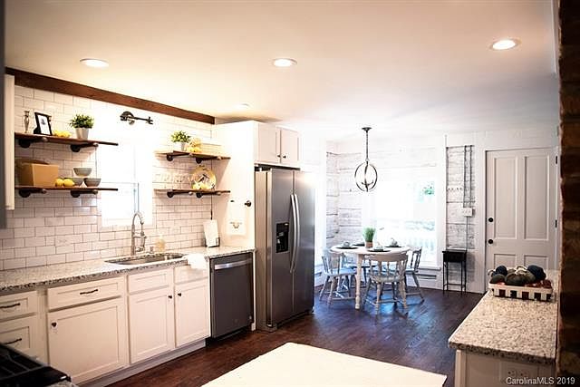 Are you looking for a private home with land in the middle of Huntersville? This is it! Completely renovated partially log built house with so much character. A true modern farmhouse. Log built Great room. Gorgeous salvaged wood(from the log great room) barn door. Master upstairs with en suite bath and huge closet. Extra Large bedroom downstairs that could be second master. Third upstairs bed is also very big. Three renovated full baths. Down bath has clawfoot tub. Brand new kitchen. Original refinished wood floors are gorgeous. New Lower level heat pump/ac, new roof and windows. All new lighting and freshly painted. Potting shed and garage with huge workshop and carport for storage and another car. Huge wooded lot with 2.38 acres of land that can most likely be subdivided as per Huntersville guidelines. This house is one of a kind and won't last long!!