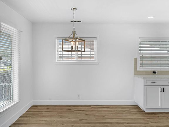 Front porchStunning kitchenReal grass lawnLarge picture windowsGrey subway tile backsplashWide plank vinyl flooringLarge patio area