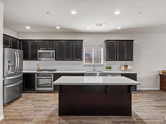 Curb appeal and open-concept living are features that define this home. Step through the double doors into the openness of the great room, kitchen, and dining areas accentuated by lofty ceilings, wood look flooring and large windows. The kitchen area is simple, yet functional, offering a walk-in pantry, stainless appliances, granite counters, and kitchen island. The split wing design has sizeable bedrooms with ample space for family or guests in addition to three bathrooms, which include an en-suite bath off the Master-suite complete with double sinks, separate soaking tub, shower, and large walk-in closet. The backyard is ideal for entertaining and hosting summer gatherings. The covered patio offers a shaded retreat equipped with a built-in barbecue complete with refrigerator for serving up cool summer drinks next to the pool. All of this and solar panels to help bring down heating and cooling costs. Located in the desirable Blackhawk neighborhood and top-rated Frontier high.