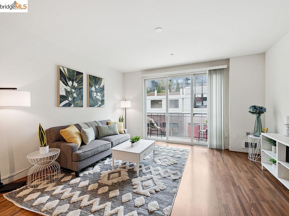 Bay Street One is a desirable townhouse complex conveniently located right above Bay Street. This 2 bedroom, 1.5 bathroom unit has an open floor plan with laminated wood flooring throughout. The kitchen features granite countertops and all stainless steel appliances, with a gas stove perfect for gourmet cooking. The spacious living and dining area leads to a private balcony. The stairway leading upstairs is illuminated by the skylight above, bringing lots of natural sunlight into the unit. Upstair floors are carpeted, with the primary bedroom suite featuring plenty of closet space. The connected primary bath boasts granite countertops with a dual-vanity with shower over tub. The second bedroom is located at the end of the hallway to provide more privacy. The washer and dryer are conveniently tucked away in the hallway closet. This unit comes with 2 tandem parking spaces in the garage. WalkScore® 90 – nearby to shops, restaurants, movie theater, and grocery stores as well as public transit, BART, Amtrak, Emery-Go-Round free shuttle, and freeway access. Only about 15 minutes to San Francisco. SUN OPEN HOUSE 2 PM - 4 PM.