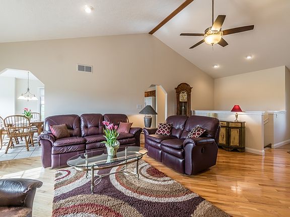 Huge price reduction on this Custom 4 bedroom, 3 bath brick ranch in the Steers Estates!Large kitchen ceramic tile,vaulted ceilings,great trim and brick work,Finished lower level with walkout and large storage area.New deck with low maintenance materials has retractable awing.Beautiful landscaping on almost 2 acres! Freshly Painted! Don't miss the full basement AND convenient Storm Shelter!