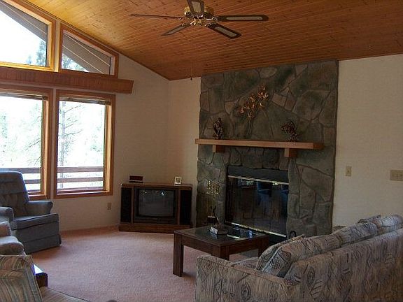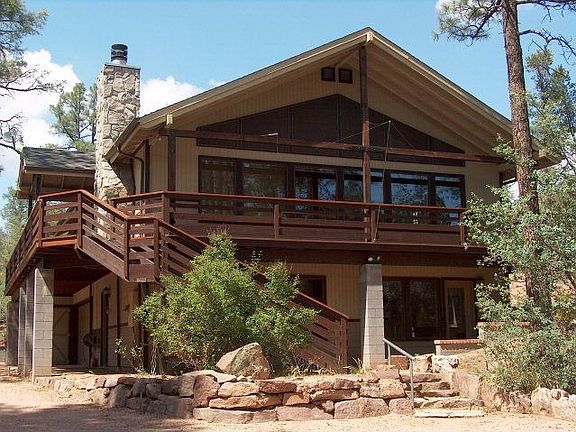 Ideal cabin in the woods situated on nearly one acre surrounded by tall ponderosa pine trees with great views of the Granite Dell Mountains. Main living level includes very nice great room with wood burning fireplace made of natural rock, kitchen and dining, master suite, guest bedroom, guest bath. Downstairs is a second guest bedroom, bath and family room. A dumb waiter in the garage makes for easy carry of groceries or other items straight up to the kitchen. The workshop has ample 220 outlets