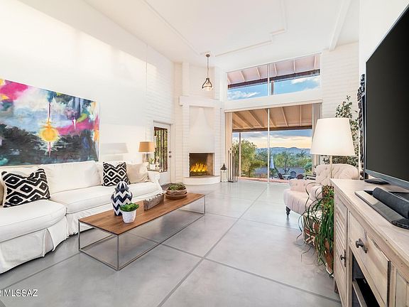 Fabulous contemporary foothills home thoughtfully renovated with designer finishes & flare. Greatroom style with the ever-popular split bedroom plan; 4BR/3 BATH, dramatic, high ceilings, clerestory windows, walls of glass & corner Fireplace. Updates include beautiful concrete overlay floors throughout w/new carpet in primary suite, walls removed, ceilings raised, interior/exterior paint, tile, backsplash, wallpaper, complete redesign of kitchen, new SS appliances, countertops, lighting, fixtures, hardware, toilets, sinks & new Butler's pantry. Amazing outdoor living includes multiple patios as well as spacious backyard oasis. Circular driveway, 2 car garage, MT, CITY & SUNSET VIEWS! Only 2 small steps between Greatroom & Kitchen*SEE UPDATE LIST*Owner is a licensed RE agent in AZ(inactive)
