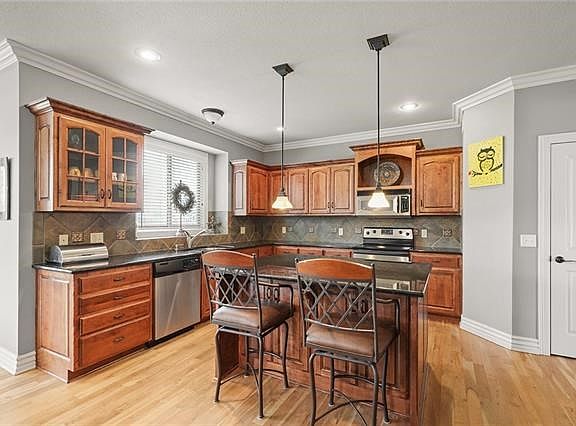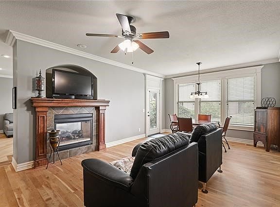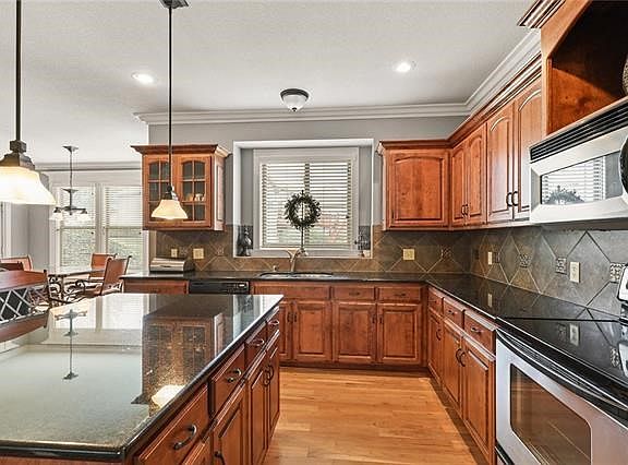 Great 2 story home in the beautiful Westbrook at Creekmoor. Enjoy peaceful nights and view of the lake on the covered front porch. Foyer has curved staircase. Custom cherry & oak floors with maple borders on main level. Large great room with lots of windows, built in cabinets, and see through fireplace. Hearth room with built in cabinet and other side of fireplace. Breakfast area has lots of windows and walks out to private back patio. Kitchen has large island, granite counters, and walk in pantry. Formal dining room off the kitchen with buffet cabinet. Master suite has huge bedroom with wood floors, and bathroom with jacuzzi tub, double vanity, and walk in closet. 2nd bedroom has it's own bathroom. 3rd & 4th bedrooms have Jack/Jill bathroom. Laundry is on bedroom level. Finished basement has large bar area, rec room with built in media center, office, bathroom, and storage area for all your stuff. Welcome home!