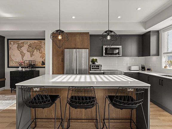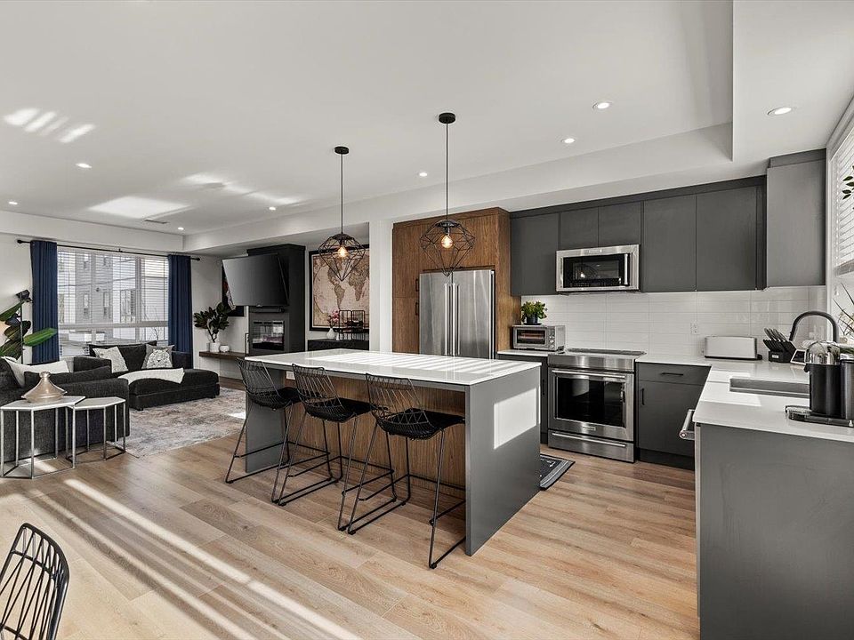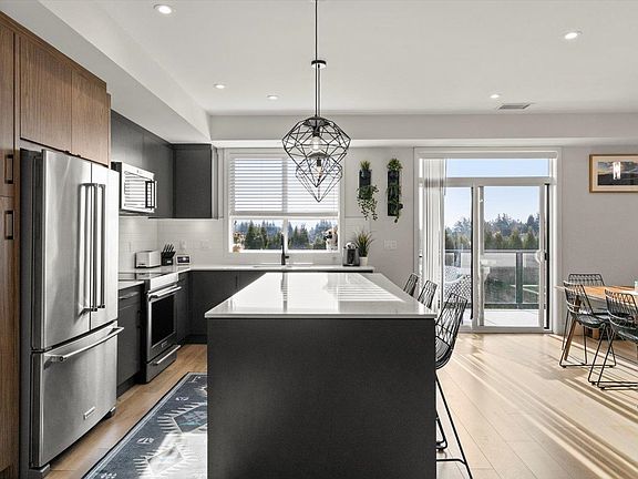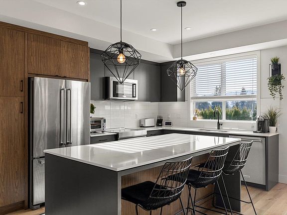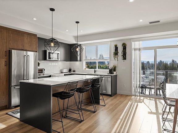 Immaculately kept townhome in the popular Cinema District w/some unique features you won't see in most others in the Valley. The main floor has serious wow factor. The open concept design makes it feel like you're in a detached home, but the finishings are what sets it off. The warm colored laminate, quartz counters, upgraded appliances & woodgrain accents in the kitchen & living room give off a modern yet cozy vibe. Upstairs the primary boasts a WIC & gorgeous ensuite w/ double sinks & large shower. The top floor is an entertainers dream space with a massive FURNISHED rooftop patio & Mt. Baker views. Other perks include, A/C, oversized double garage, great freeway access & walking distance to Abby Entertainment Centre UFV + other amenities. CAN YOU SPOT ALL THE CORGI'S IN THE PICS?