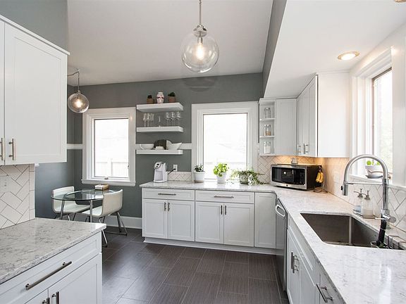 Classic 2 story close to downtown has been beautifully updated throughout! Gorgeous new kitchen with quartz counters, white cabinets, floating shelves, glass cabinetry, tile floors, stainless appliances and new lighting. Original hardwood floors, wood trim and doors. Light & airy living room w/ white painted brick fp. Glass doors leading to sun room/playroom. Grand staircase leading upstairs to 3 bdrms and 2 baths. Master bdrm with 2 closets and new bath with cabinet, counters, tile shower & lighting.