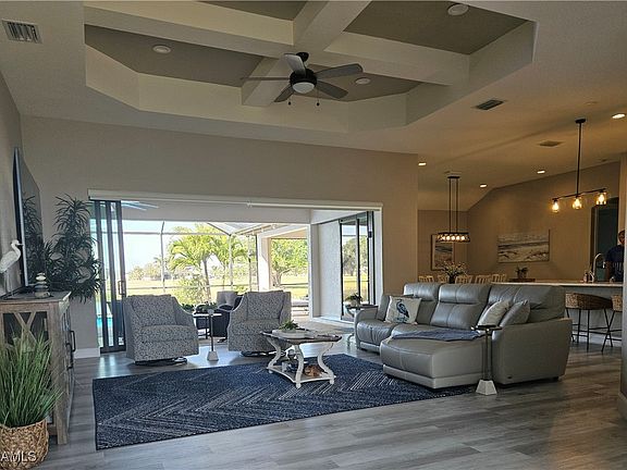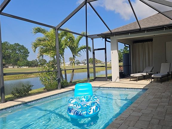Catch the amazing water view sunsets and relax on a beautiful pool deck and lanai overlooking Coral Oaks golf course in desirable NW Cape Coral. The heated pool has a private bath, outdoor kitchen with BBQ, outdoor dining, and two separate furnished hang out areas. The spacious home has a huge kitchen with island, coffee bar and separate indoor dining with the pool and water view. The family room features large pocketing sliding doors across the back of the house. The large primary bedroom also has pocket doors that open to the pool deck with an ensuite bathroom with dual sinks/vanities, walk in shower, and a make-up table. Additionally it has two separate guest rooms, a guest bath, and a private workspace. The neighborhood is family friendly with lots of places to walk and bike. Matlacha and Pine Island Road are close by with a short drive to restaurants, bars, and shops and is only 20 minutes to downtown Punta Gorda. Rent discounts available for multi-month short term rental in offseason (May-October).
