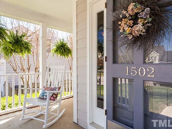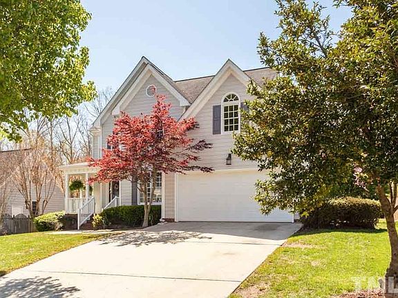 Sweet Apex home with splendid small town charm! Short bike ride or walk to downtown! Home offers lovely open floor plan from the kitchen and family room. Separate formal dining room w/custom crown molding and chair rail. Great size bedrooms! Master suite has huge WIC, dual vanity, and large tub. Bonus room over garage ideal for a playroom or office. Enjoy the summer on a rocking chair front porch and gorgeous, sunny south facing backyard with a garden area, deck, and patio perfect for entertaining!