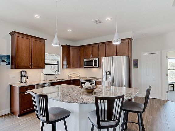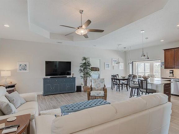 Welcome to your piece of Florida Paradise! This custom-built home is not your typical "cookie cutter" with plenty of incredible features throughout the home. The open floor plan is highlighted with coffered ceilings, porcelain tile and pocket sliding glass doors (hurricane impact glass) that let the natural light flood the interior and create a flow for indoor/outdoor living. The oversized lanai offers over 1,400 square feet of outdoor living space and the pocket doors help create the oasis that you crave. The kitchen is the heart of the home with solid wood soft close cabinets, level 3 granite, and spacious island. The split floor plan lets everyone have their own private retreat; with a spacious master bedroom with a private entrance to the outdoor living space. The en-suite bathroom has a large walk in shower, dual sinks, and walk-in closet. With sound proof insulation in the interior walls, 6-inch gutters, and upgraded landscaping, this home is truly the perfect place to enjoy. This area of South Gulf Cove is a stunning area for bird watching from the comfort of your expansive lanai. This quiet neighborhood is secluded enough to have peace and quiet but in just minutes you can be to major shopping, restaurants, and road ways. ¤ Please see 3D Tour and Video ¤