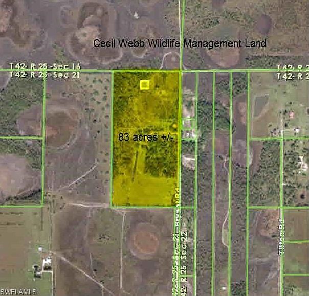 83 Acres across from Babcock Ranch that backs up to Cecil Webb Preserve. 1994 Manufactured home. Property has pines and native vegetation. Area of development. Zoning is agricultural and is one house per 10 acres.