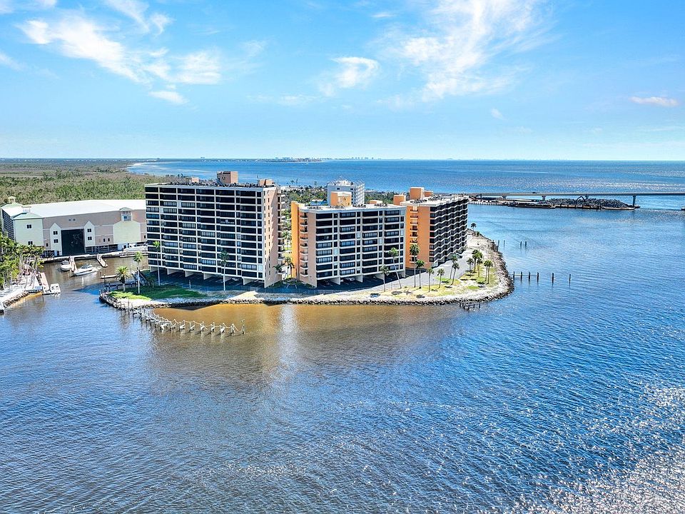 Exceptional panoramic views of the Bay & Islands. 8th floor 2bed/2bath end unit with multiple balconies and impact windows/sliders throughout! Offering an open floorplan ready for you to customize. The kitchen features wood cabinets, tray ceiling and granite countertops. This unit is light and bright with an abundance of natural light and a bonus balcony off the dining area. Parking is under the building or open and not assigned in Building 2. Amenities include a pool, spa, cabana area, grilling area, shuffleboard, tennis and pickleball courts and on-site property management. Nearby you will find Sanibel Island Causeway, Bimini Bait Shack, Sanibel Harbour Yacht Club and Sanibel Harbour Marriott Resort make living in the Florida lifestyle easy. Occupancy expected late summer/fall 2025