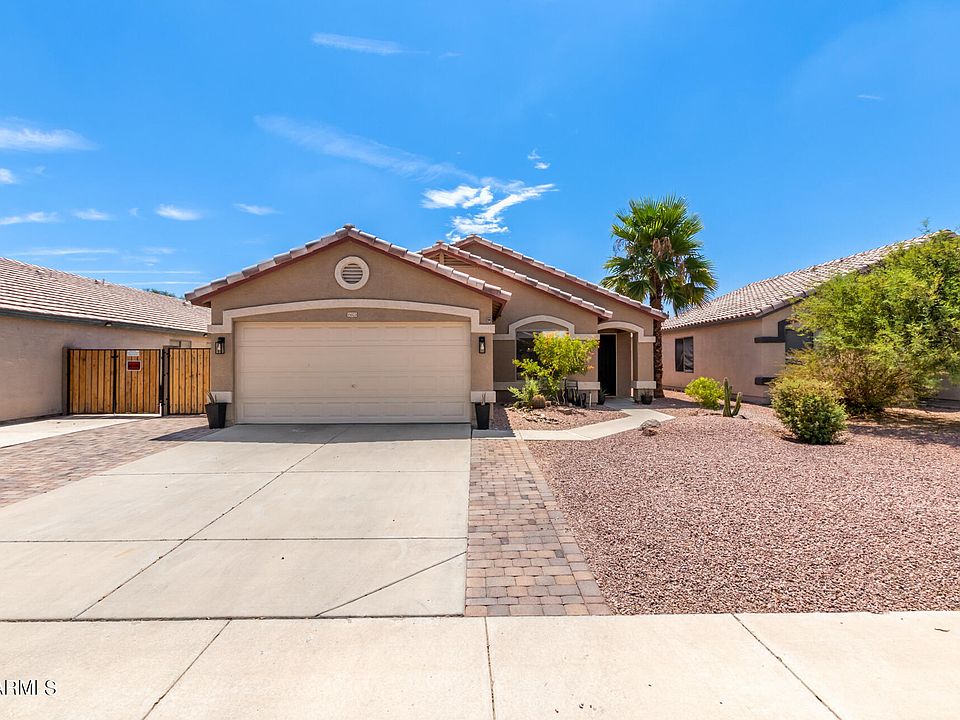 Take a look at this adorable 3-bed, 2-bath home situated in Ashton Ranch! Displaying a 2-car garage, RV gate, and low-care front yard. As you enter, you're greeted by the carpeted living room featuring vaulted ceilings that add a touch of grandeur and spaciousness. Versatile den is perfect for quiet moments or can be used an office. Continue onto the bright & airy eat-in kitchen boasting recessed & pendant lighting, stainless steel appliances, ample cabinet space, a center island with a breakfast bar, and sliding glass doors leading to the back patio. The sizable main bedroom includes a private bathroom and a walk-in closet. Hang out in the serene backyard providing a covered patio, pavers, a lovely gazebo, and artificial turf. Don't miss this one-of-a-kind value. Act now!