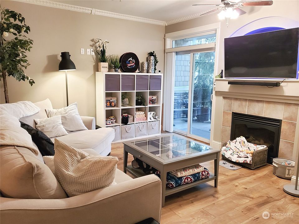 Enjoy privacy in this quiet pet-friendly corner unit in a gated community! Updates include newer HVAC System, hardwood, vinyl plank flooring and non-EMF paint. Kitchen boasts ample counterspace, crisp white cabinets, and a pantry. Master bedroom features walk-in closet and patio access. Other perks include a cozy gas fireplace, storage off the patio, private garage plus plenty of guest parking. Community features include clubhouse lounge with kitchen, fitness space, and media rooms. Close to restaurants and easy access to Hwy99, I5 and 525. Close to the new, upcoming Light Rail Station, shopping malls and many amenities!