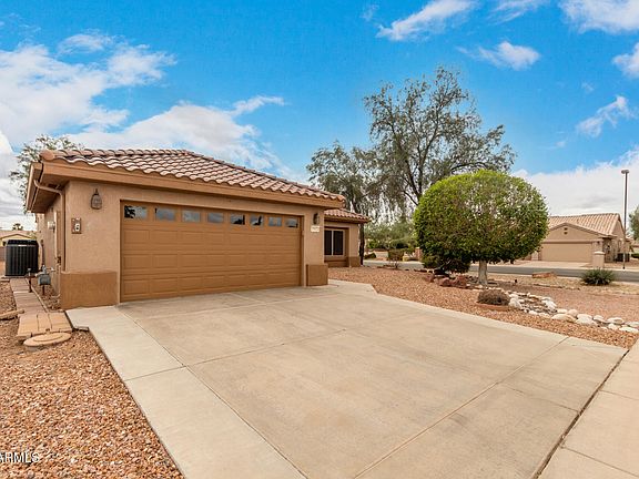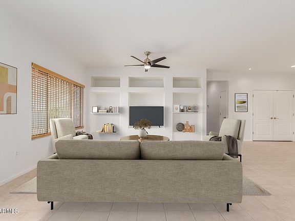 This beautifully maintained Sun City Grand home is packed with upgrades! The open and bright floor plan features architectural details throughout. Custom niches are included for TV equipment, complemented by neutral tile and wood flooring, new lighting, a spacious walk-in closet, large bathrooms, and an oversized garage. The front and back yards are professionally landscaped with easy-to-maintain desert terrain, plus fruit trees and a long covered patio. The gourmet kitchen boasts top-tier stainless steel appliances, plenty of cabinet and counter space, a breakfast bar, and abundant natural light. This home is a must-see!