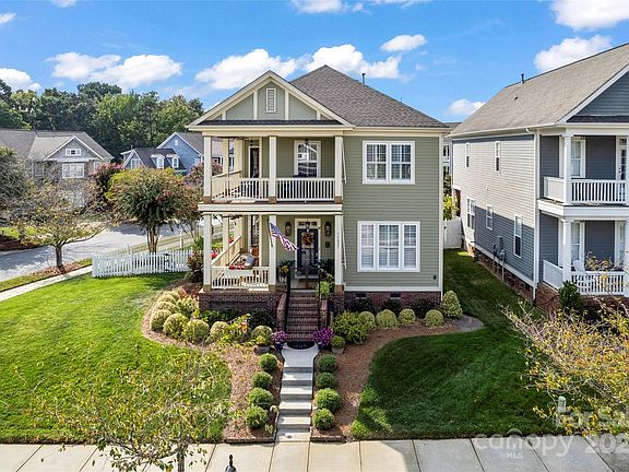 Resort-style living meets Charleston-like charm and elegance in this meticulously upgraded Skybrook stunner. This Charleston-style home on a desirable corner homesite offers delightful curb appeal with lush landscaping, a paver rear sidewalk, driveway extension, and double wraparound porches with Charleston-style gas lanterns and hurricane shutters. Located in Cabarrus County, the property benefits from no city taxes and access to highly rated Cabarrus County Schools.Inside, you’ll find an inviting, open floor plan filled with thoughtful upgrades and timeless details. The kitchen and bar area have been beautifully refinished with updated cabinetry, a brick tile accent wall, Charleston-style lighting, and Frigidaire Professional appliances. A reverse osmosis water system and the conversion to a gas range with an exterior exhaust elevate functionality, while a board-and-batten breakfast nook wall and beadboard bar accent add warmth and character. The living room features a stunning coffered ceiling, custom built-ins, hardwood floors, and a stylish designer “fandelier.”Hardwood flooring continues through the stairs, upper hallway, and into the spacious primary suite, which also boasts an accent wall, a custom closet with upgraded lighting, and elegant new fixtures. The primary bath shines with refinished cabinetry, updated mirrors and lighting, and a sleek shower door. Secondary bedrooms include custom closets, upgraded ceiling fans, and mounted televisions. Throughout the home you’ll find updated lighting, plumbing fixtures, and plantation shutters, creating a cohesive, elevated design.