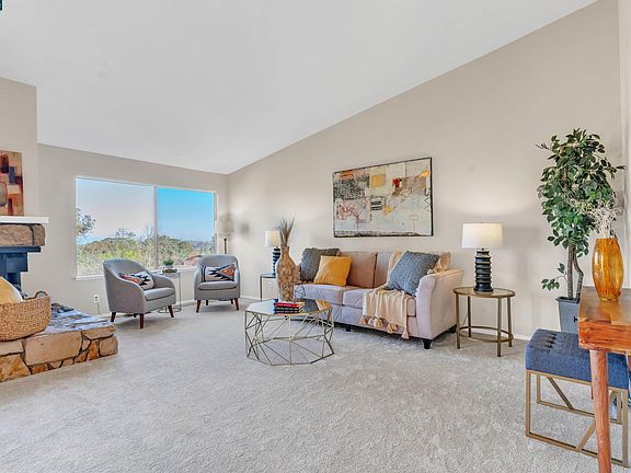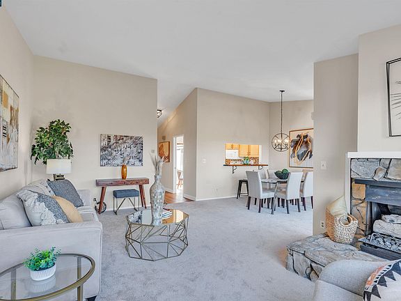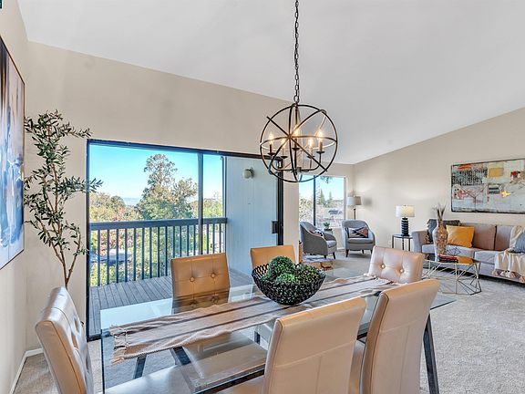 Beautiful townhome nestled into the hillside w/ views overlooking the trees & wooded open space from every deck. The airy open floor plan enjoys huge windows, tons of natural light & soaring ceilings. The kitchen features stained wood cabinets, tile backsplash, breakfast bar seating & glass doors to the front deck ideal for indoor/outdoor entertaining. Enjoy the open dining area with a modern chandelier, half bath & living room offering a stone fireplace & deck w/ picturesque views of the rolling hills. The primary suite offers large windows, glass doors to the deck, two separate closets & an ensuite split bath with a walk-in shower. Enjoy 2 additional bedrooms,1 with deck access & a hall bath with a shower/tub. Additional features include LVP flooring in entry, kitchen & half bath, new interior paint & carpet throughout, spacious exterior storage closet & 2 car carport parking. HOA includes community pool & tennis courts. Minutes to parks, hiking trails, shopping & K-12 schools.
