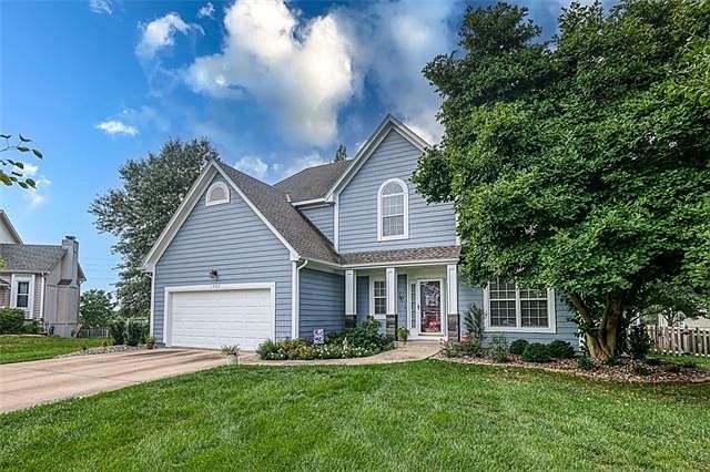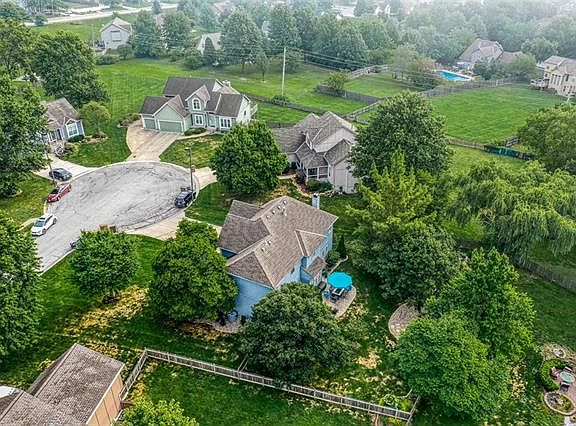 Beautifully situated traditional 2-Story on an estate lot in a quiet cul-de-sac with beautiful landscaping, backyard privacy and fresh air. You'll love the stamped concrete patio and mature trees throughout the property. Enjoy the open floor plan - great main floor flow for family and entertaining. Kitchen has all the amenities, plenty of cabinet space, desk and casual dining area. Formal Living and Dining rooms complete the space. Master suite is huge with great bath and closet space; 3 secondary bedrooms and utility room complete the 2nd floor. Basement is stubbed for a bath and ready for your finish. Community Pool supported in your taxes. Walk to Elementary School. Close to all Raymore amenities and 49 Hwy. No active HOA.