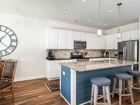 Beautiful single story built in 2018 features an open split bedroom floor plan. Master bedroom suite is in the far left corner and 2 other BR's on the front right. A stylish ship lapped island with upgraded granite and farmhouse sink is the focal point of the kitchen. Giallo Napoli granite on island and honed black on the perimeter. The gorgeous wide plank driftwood color flooring throughout the living space, high ceilings, and light filled windows combine to create a warm and welcoming coastal ambience. Two car garage. A covered patio looks out over the private fenced backyard with views of the wooded wetlands buffer. Convenient location to shopping, dining, and the brand new CE Williams Middle School and new public library, both on Sanders Rd.