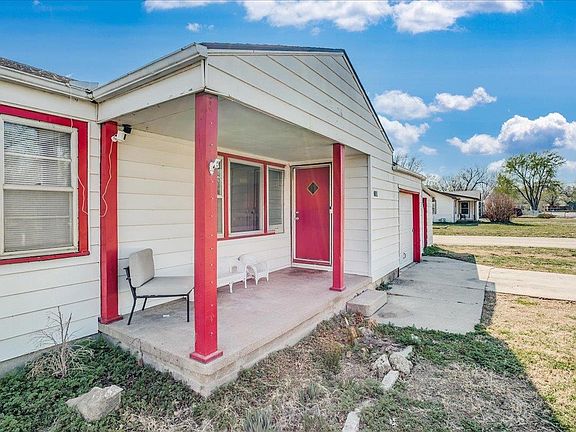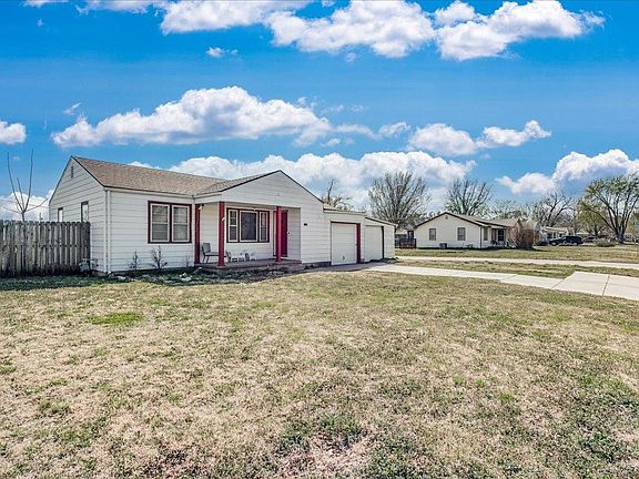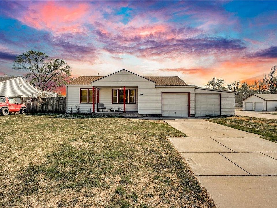 Ranch home on a half acre corner lot in south central Wichita with a newer roof (2022). Head up the covered front porch, perfect for a cozy seating area, and step inside to find updated, modern spaces with luxury vinyl flooring throughout. The living room boasts big windows that flood the space with natural light. The stylish kitchen features green painted cabinets that beautifully complement the wood laminate floors and tiled backsplash, plus open shelving for storage and display. The adjoining dining room offers access to the back deck through French doors, providing lovely views while you eat or enjoy your morning coffee. The master bedroom includes a sizable closet, and two additional bedrooms and a full bathroom complete the home. The fully fenced back yard is enormous, with a deck, patio area, storage shed, and plenty of space for all kinds of activities and adventures. This home is conveniently located near parks, grocery stores, quick highway access, and major employers. What are you waiting for? Schedule your private showing and see this home today before it's gone!