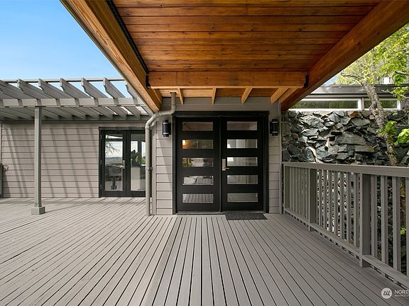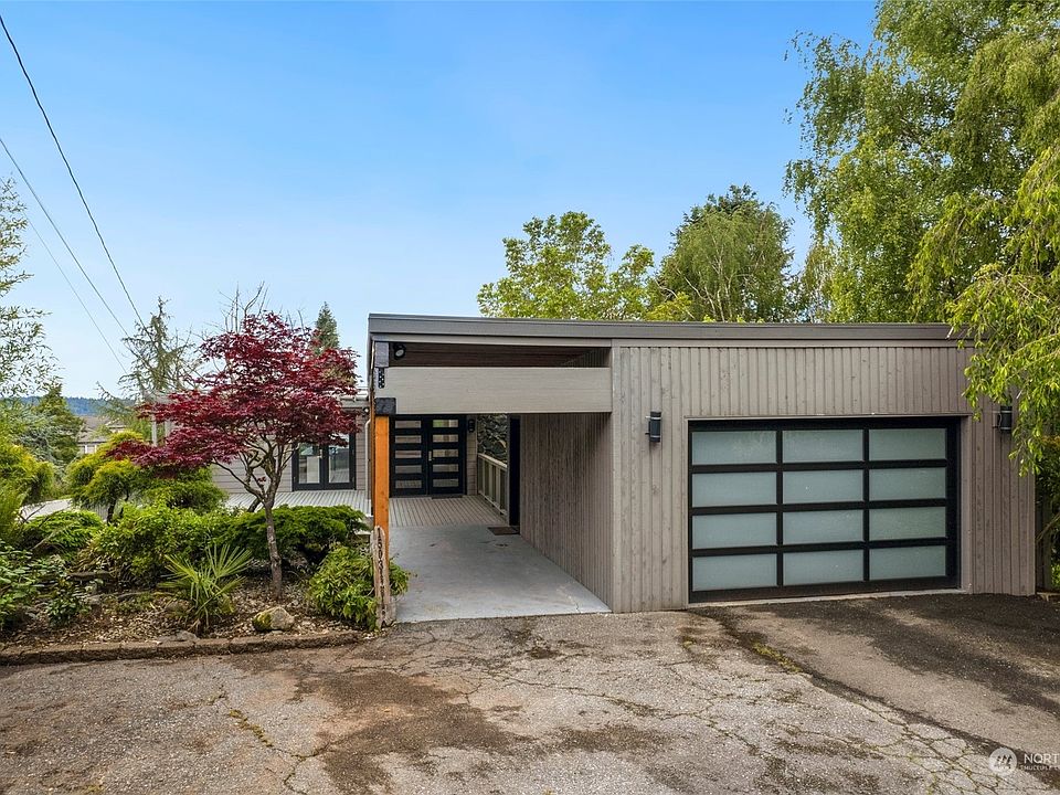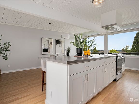 Look no further than this Mid Century modern home completely remodeled and ready for the stunning summer sunset views overlooking the Sound and mountains. Top level boasts a large entertainment deck, chef kitchen with huge island, quartz counters, and abundance of natural light with windows throughout. Primary + 2 additional bedrooms on 2nd floor along with access to the covered deck. Downstairs features a second full kitchen, 4th bedroom and living space, perfect for income generating MIL with its own driveway and separate entrance. Great schools and convenient location complete this home. Come see this one for yourself!