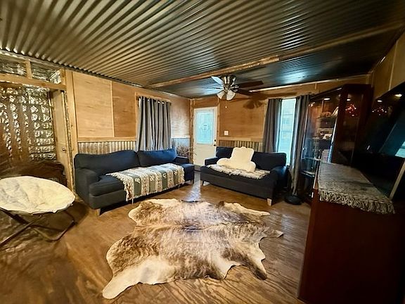 Updated 2/2 ranch-style home with barndo-inspired character. Open-concept kitchen/living area features granite countertops, new cabinets, and new appliances. Reclaimed wood flooring and wood ceiling in bedroom add warmth, while reclaimed tin accents in living and kitchen areas create a rustic-industrial feel. New windows, enclosed carport, cedar accents, and new driveway add function and curb appeal, plus a 50-amp RV hookup. Windmill-style ceiling fan and rustic porch lighting enhance the design. One bath offers a tiled walk-in shower; the second includes a tub/shower combo. Single-story, move-in ready, with exterior paint updates scheduled for January 2026 providing added value for the next homeowner without the upfront cost or planning.
