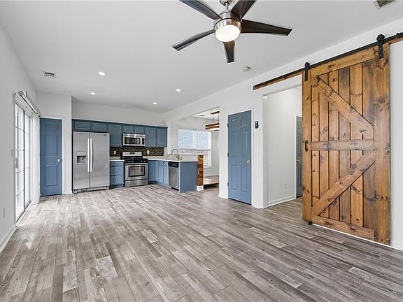 Stylish barn doorPrivate fenced backyardCozy family roomWood accent detailsStainless steel appliancesLuxury lvp flooringWalk-in closet