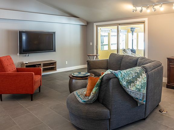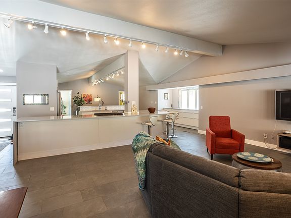 The open-concept is seamless in its approach, for entertaining or evenings with the family; integrating a free-flowing design that will leave you breathless. Every aspect of this home has been meticulously renovated, infused with a contemporary ascetic. Natural light floods from every window, creating a vibrant palette of colors that illuminate a relaxing space, from the fireplace nook, to the expansive kitchen with a wrap-around island, waterfall countertops, and custom cabinets, and vaulted living area; this is the heart of the home. Adjacent to the living area is an enclosed three-season room and access to a private patio.