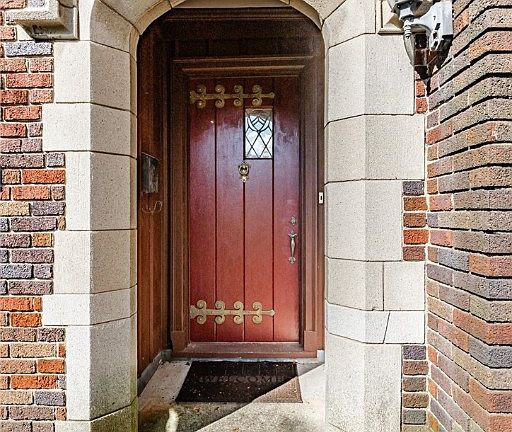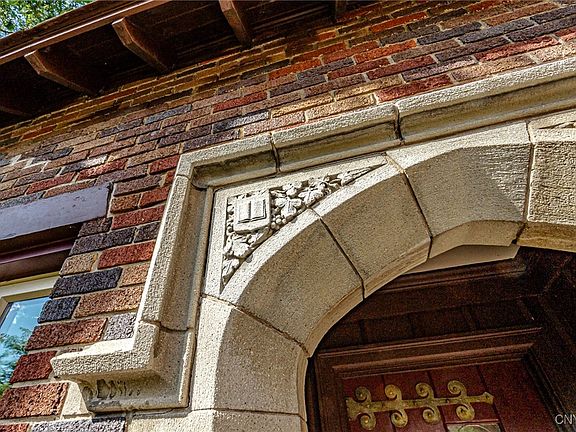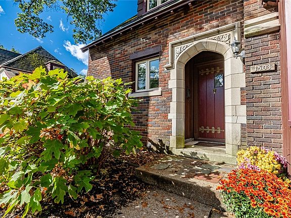SOLID, well-built & beautifully maintained, this Tudor Revival is a SHOW STOPPER with all of the charm & special detail that you can possibly imagine! Gable roofline, asymmetrical floor plan, half timbering mixed with brick & stucco... and the prominent peaked arched doorway with leaded glass is right out of a fairy tale. Take a moment to pause and appreciate the decorative stone entry, carved with judicial symbols, a nod to the home's first owner.