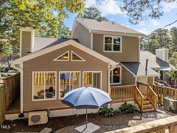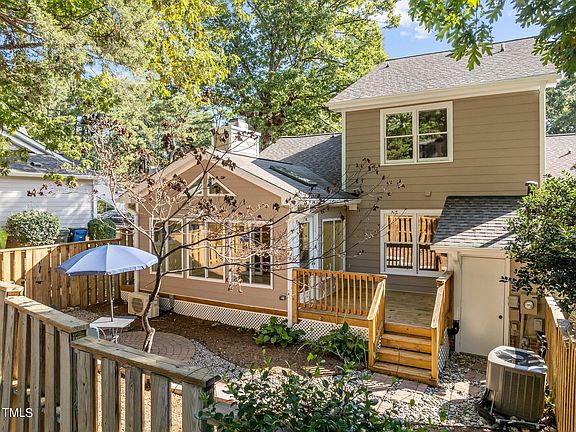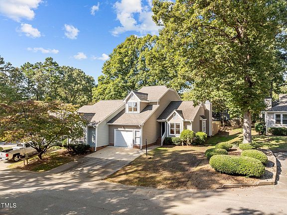 Thank you for all the offers, showings and interest in this property! We are now under contract. Meticulously maintained and thoughtfully upgraded end unit townhome on private cul-de-sac with rare oversized attached garage PLUS first floor owners' suite in sought-after North Ridge Villas, North Raleigh. Its modern amenities and cozy transitional interior touches make it a dream residence. Overall, this home offers a perfect blend of classic charm with modern convenience, making it an ideal haven from the busy day to day grind. Interior Features: • Transitional open floorplan 3 Bedrooms, vaulted family-dining-kitchen-sunroom & attached oversized garage that provides an additional 366 SqFt that can be used for your vehicle or as added storage and is not counted in the 1,810 living SqFt total. • Fully renovated gourmet kitchen and breakfast area 2015 includes new maple wood cabinets with soft close drawers, granite countertops, stainless-steel appliances with built-in microwave, chair molding, pantry, vaulted ceiling, exposed rafter beams, and an interior window view above sink into family-dining room. • Impressively inviting family-dining room with vaulted ceiling, exposed rafter beams, chair molding, masonry stone fireplace, and remote-controlled gas logs added 2021. • Surround glass sunroom addition permitted 2016 extends family-dining room area through double sliding glass doors with vaulted ceiling, 2 skylights and mini-split HVAC unit added 2022. • First floor owners' suite with 2 sizable closets, fully renovated bathroom 2017 with dual vanities, huge-customized mirror, granite countertop, tiled floor, grand sliding glass door walk-in shower enclosure, tile shower walls and 3 convenient niches. • Upstairs there are 2 sizable bedrooms, one with a built-in desk plus a separate sitting area. • Upstairs bathroom with ceramic tile flooring and tub/shower combo. Exterior Features: • Front entryway covered porch provides visitors protection from the elements. • Attached oversized garage with new door 2021 and new electric opener 2021 (very few townhomes include a garage, much less an attached garage). • Backyard fenced with privacy fence was pressure washed and clearcoat sealed 2024. • Backyard retaining wall & brick patio permitted 2021. • Back deck pressure washed and clearcoat sealed 2024 connects to the enclosed sunroom addition. • Backyard HOA common area, dotted with mature trees offering shade, privacy, and tranquility. • Exterior fiber cement siding and trim was replaced where needed and painted by the HOA in 2024. • Architectural shingles roof replaced by HOA in 2022. • Well-maintained and landscaped in a quiet wooded cul-de-sac lot. • 5-inch gutters replaced by HOA 2024. • Gutter drainage system to direct rainwater away from home installed in the rear 2022 and in the front 2024. • Paths & sidewalks lead to nearby amenities such as numerous grocery stores, shopping, restaurant options, and Millbrook Exchange Park. Additional Features: • Smooth ceilings throughout (popcorn ceilings removed 2023). • All main level flooring replaced 2024 with 9'' wide Ocracoke 20mil wear level Luxury Vinyl Plank (LVP). • All rooms (main level and second level) repainted 2023 including walls, ceilings and trim. • HVAC Lennox System, natural gas furnace, 2016. • Natural gas hot water heater, 2012. • Crawl space with access from inside the backyard storage room, with vapor barrier added 2023. • HOA amenities include a sizable neighborhood pool, 2 tennis courts, clubhouse, and children's playground all within easy 5-6 minute walking distance from this townhome.