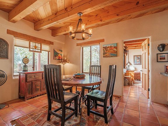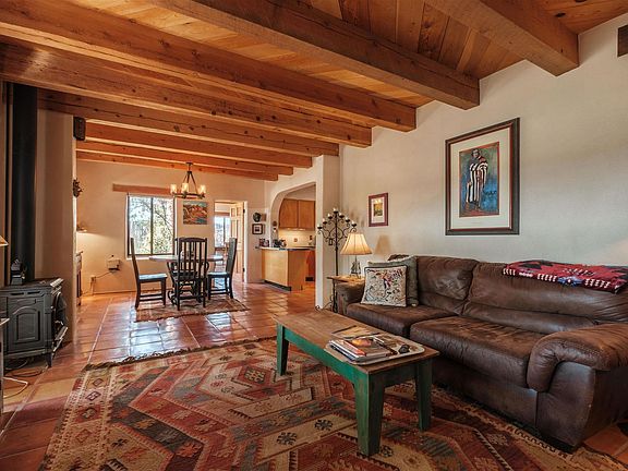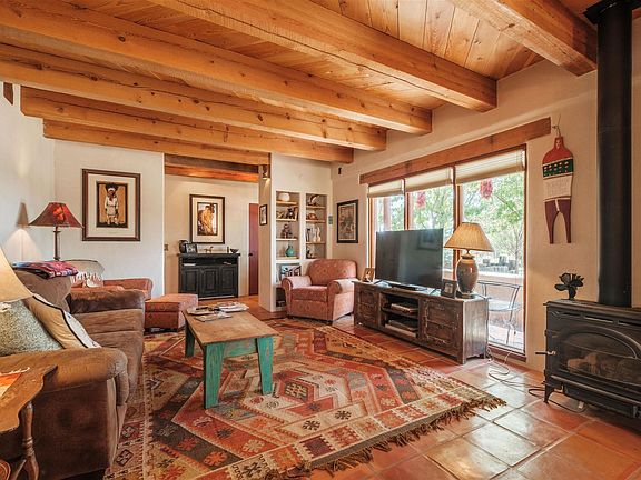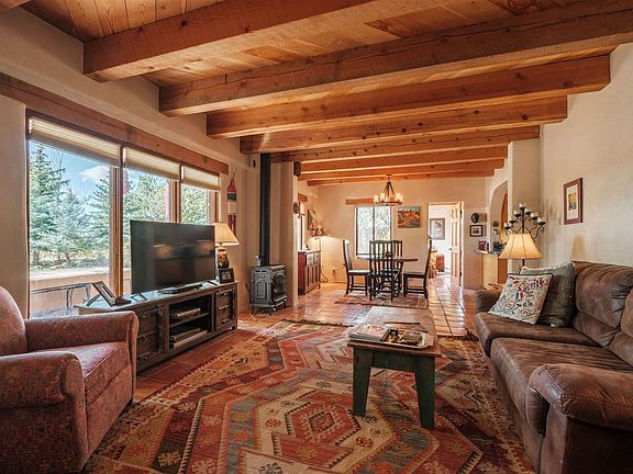 A Lush Paradise on Blueberry Hill ~ This tree covered property in the high-desert of Northern New Mexico is a rare rare find. The 3 bedrooms, 3 bathroom Southwestern architectural style home is the perfect place for full-time living, or occasional Taos retreats. The large yard surrounding the home is ideal for pets to run freely, the children to play safely, or space for potential expansion and even a second dwelling to maximize investment potential. The home itself consists of several tasteful and traditional finishes including solid beams with herringbone 2x10 boards on the ceilings, Saltillo tile floors, arched doorways, and the list goes on. The split layout offers a great deal of privacy, and the converted heated bonus room offers additional space to be utilized as a workout room, artists studio, or perhaps a second living space. Upon stepping outside the home into the lush backyard you are mesmerized by the tranquil sound of flowing water from the fountains in the presence of a variety of fruit trees (cherry, plum, apricot, apples, pears, and peaches) as well as numerous mature shade trees. Just outside of the immediate backyard perimeter you will find a gathering space with a firepit and breathtaking views of Taos Mountain. Conveniently located and an easy outlet to Taos Ski Valley, the Town of Taos, and Rio Grand National monument. Jump on this place fast, it won't last long!