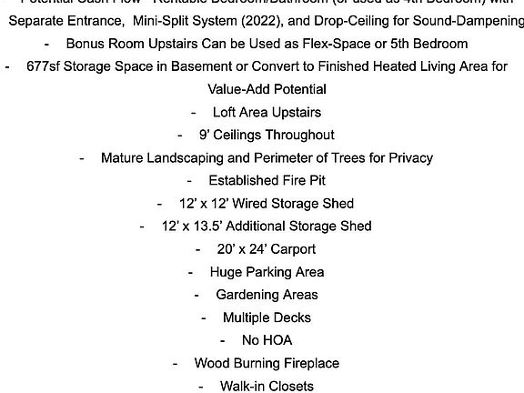 Be King of the Castle in this magnificent custom-built all brick home! Situated on a large lot, the lush yard is adorned with gorgeously manicured landscaping. Soak in the beauty and sounds of nature in the privacy created by the perimeter of mature trees. Cute covered front porch entry. Inside the soaring ceilings in the great room are anchored by a cozy wood-burning fireplace, providing an open and airy feel. 9' ceilings throughout. Excellent floorpan, great layout and flow. Spacious kitchen with plentiful cabinet and countertop space. Primary suite on main with sizable master-bath. Bedrooms have walk-in closets. Additional bonus room upstairs can be 5th bedroom, with loft space for lounge/office. Fully rentable downstairs bedroom and bathroom (with separate entrance) to help with cashflow! Amazing storage space in basement. Enjoy the fairy-book paradise outside on the multi-level deck. Functional wired shed, storage shed, and carport. Great location and no HOA! Showings start 5/21.