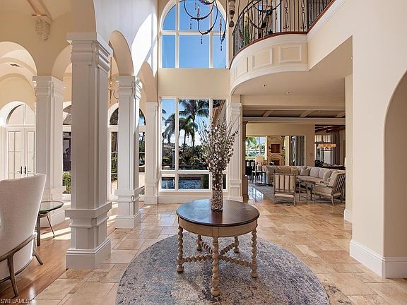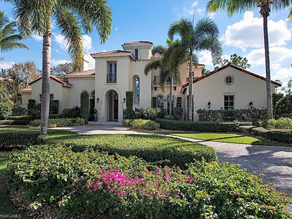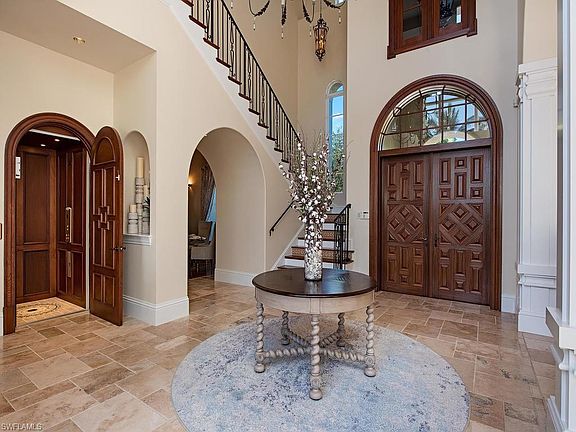 NEWLY FURNISHED AND REFINISHED. This opulent two story estate boasts all of the amenities you would expect from a home of this magnitude. You are instantly captivated by the abundance of architectural appointments and attention to detail including the volume ceilings highlighted by tray and barrel design elements, crown molding and exposed beam accents. Other features include arched passageways and thresholds, extensive windows, gorgeous granite countertops, and carpet, handsome wood and natural stone flooring. Luxurious amenities include a private elevator, wine cellar, butler's pantry, media/game room complete with a wet bar and theater, a covered outdoor summer kitchen as well as a guest suite boasting private entry. Enjoy tropical outdoor living soaking up the Florida sunshine in the open air outdoor living spaces surround the custom pool and spill over spa with south eastern sparkling lake and sweeping golf course views beyond.