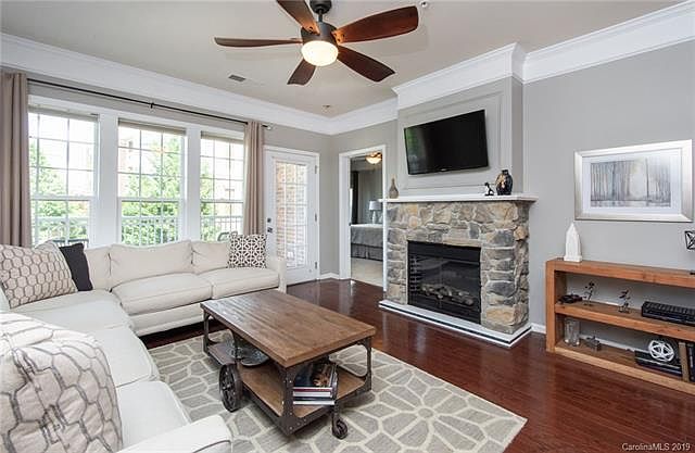 Absolute Move -In Condition! This beautifully updated home is just waiting for you! From the second you step inside, you will appreciate the open floorplan. Updates include the flooring, kitchen with granite counters, unique stone surround fireplace, light fixtures, stainless steel appliances, and interior paint. The 3 bedroom plan can be 2 bedrooms and a den with french doors. The den is large enough for a sleeper sofa for overnight guests. Enjoy your morning coffee on the large balcony. The master bedroom suite is large enough for a king size bed and a full bedroom set. The master bath has 2 sinks, a large shower, a water closet, and a linen closet. You will love the custom walk-in closet which has plenty of room to get organized. The second bedroom is a good size. Enjoy the community amenities which include: a clubhouse and pool. It is conveniently located in the heart of Ballantyne. Restaurants, shopping, and entertainment are just a short walk across the street.